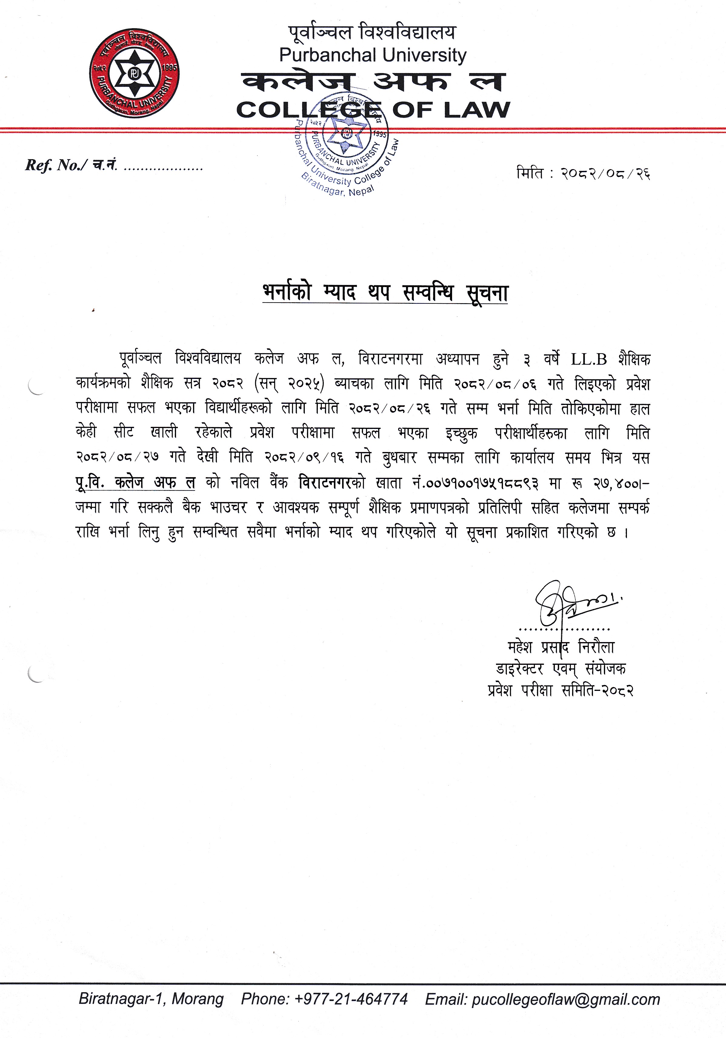 LLM २ वर्षे कार्यक्रमको २०२६ ब्याचको लागि फारम भर्ने म्याद थप तथा प्रवेश परीक्षाको मिति तोकिएको सम्वन्धि सूचना ।